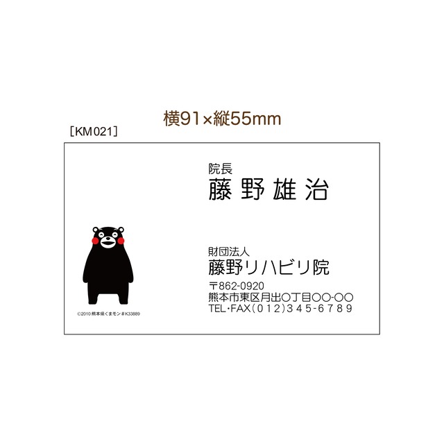くまモンのイラストがかわいい、インパクトのある名刺です!! 5種類の書体、2種類の用紙の中からお選びいただけますので、オリジナリティーあふれる、あなただけの名刺が作成できますよ! 1セット100枚での販売となります。 サイズ : 横91×縦55mm 旧字・特殊文字につきましては、※ 印を付けて分かりやすくお知らせください。 名刺は個別製作ですので、1週間程度製作期間をいただいております。 ご入金確認後、1週間程度後の発送となりますので、ご了承下さい。 くまもとサプライズキャラクター くまモン Ⓒ2010熊本県くまモン♯K33889