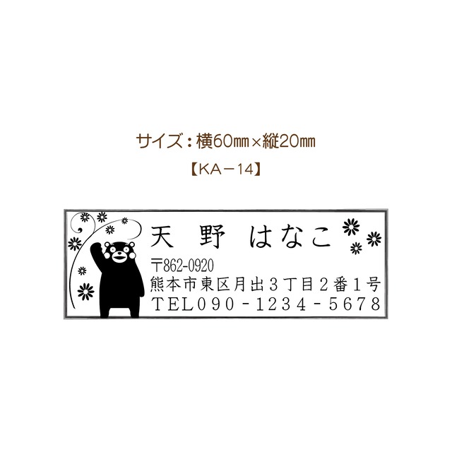 くまモンのイラストがかわいい、自宅で便利に使えるアドレススタンプです。 フリマサイトやプレゼントのお届けなど、郵送の機会が増えているこの時代に、手軽に使えるアドレススタンプはおすすめです! 可愛いくまモンのデザインが、あなたの郵便物をより楽しく、個性的に演出しますよ! サイズ : 約2cm×6cm 旧字・特殊文字につきましては、※ 印を付けて分かりやすくお知らせください。 アドレススタンプは個別製作ですので、1週間程度製作期間をいただいております。 ご入金確認後、1週間程度後の発送となりますので、ご了承下さい。 くまもとサプライズキャラクター くまモン Ⓒ2010熊本県くまモン♯K33887
