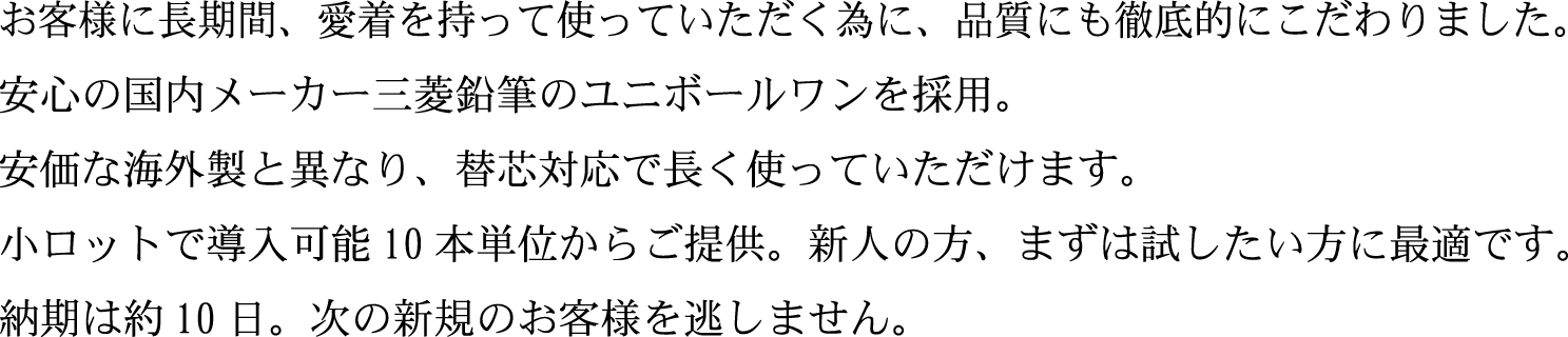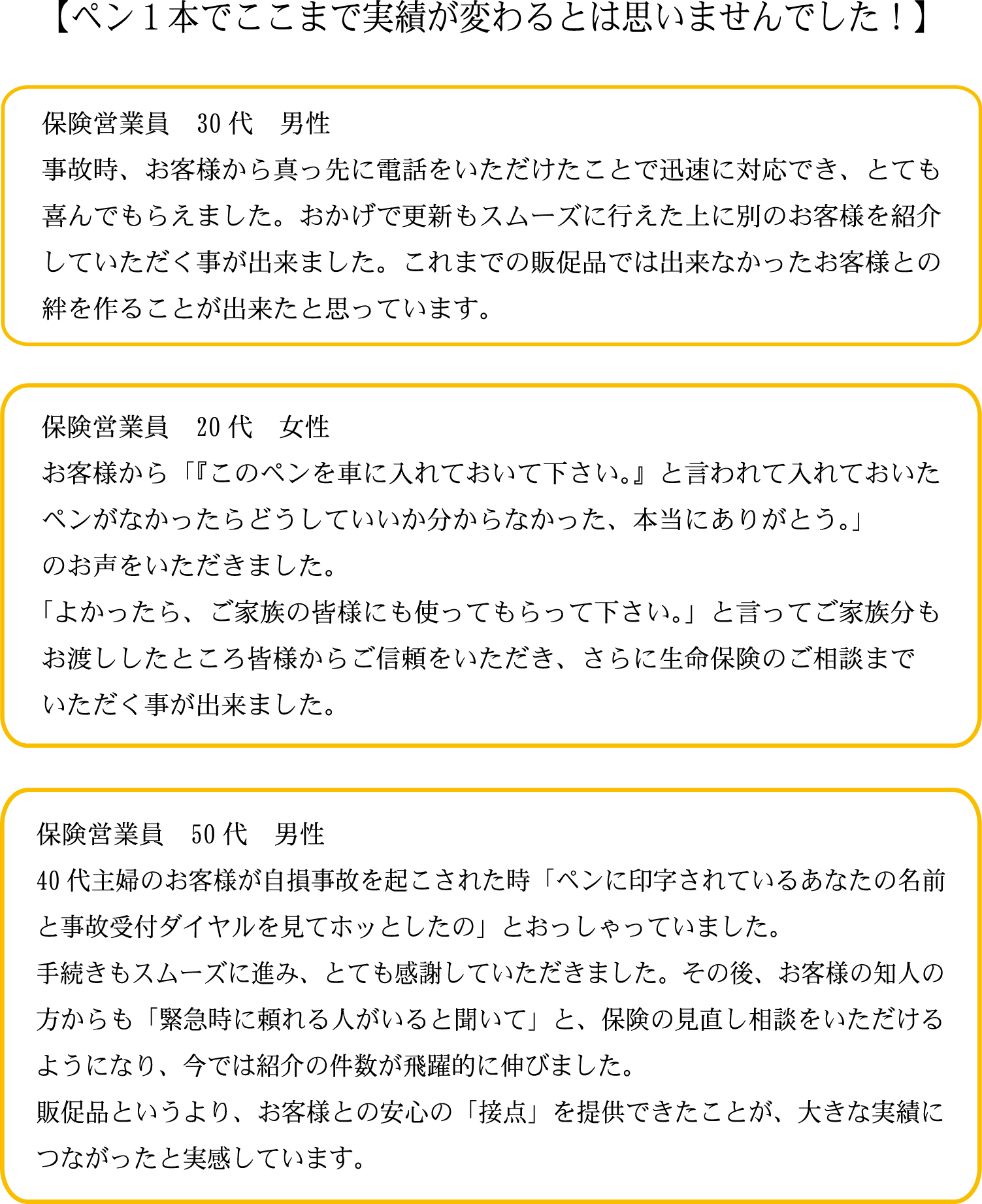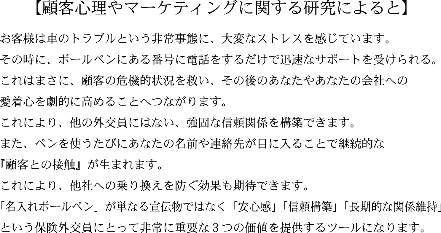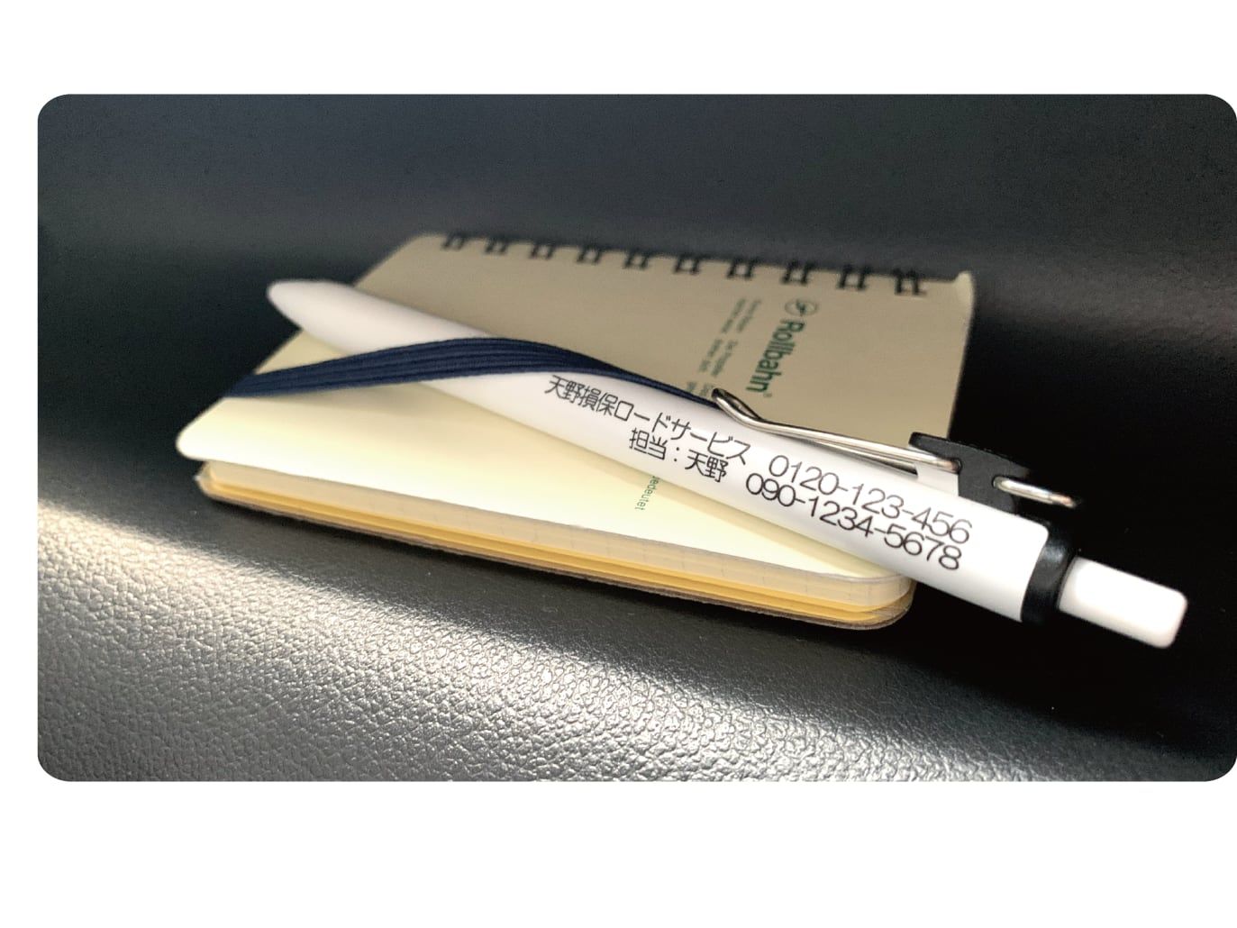 一般的なPR用の企業名入りボールペンとは違い、ロードサービス(コールセンター)と担当者であるあなたの名前、そして電話番号を印刷した名入れペンです。