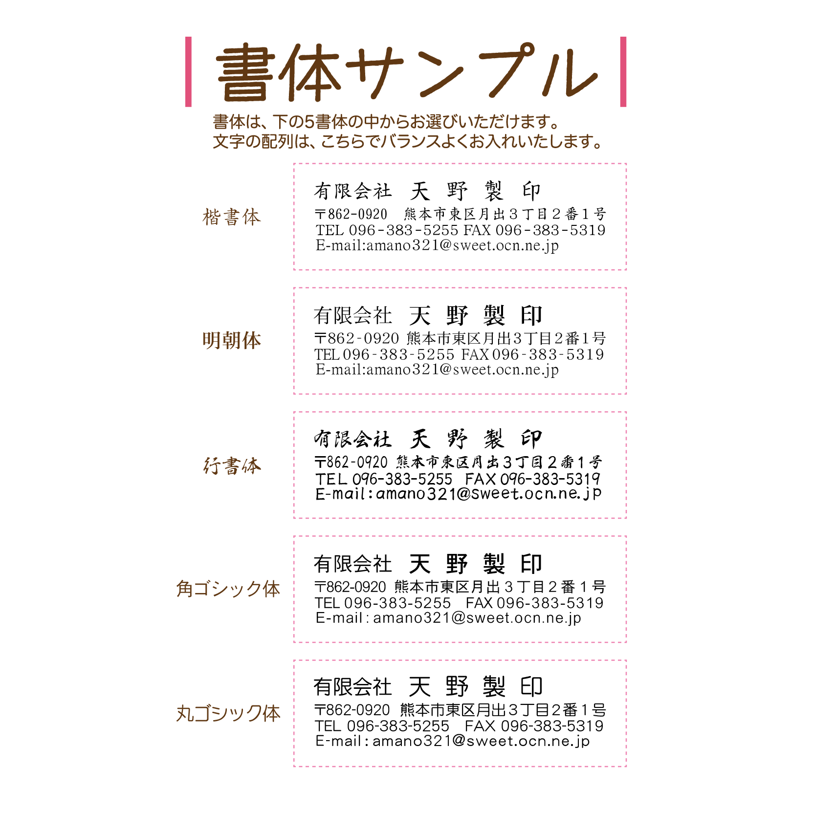 5種類の書体、2種類の用紙の中からお選びいただけますので、オリジナリティーあふれる、あなただけの名刺が作成できますよ!